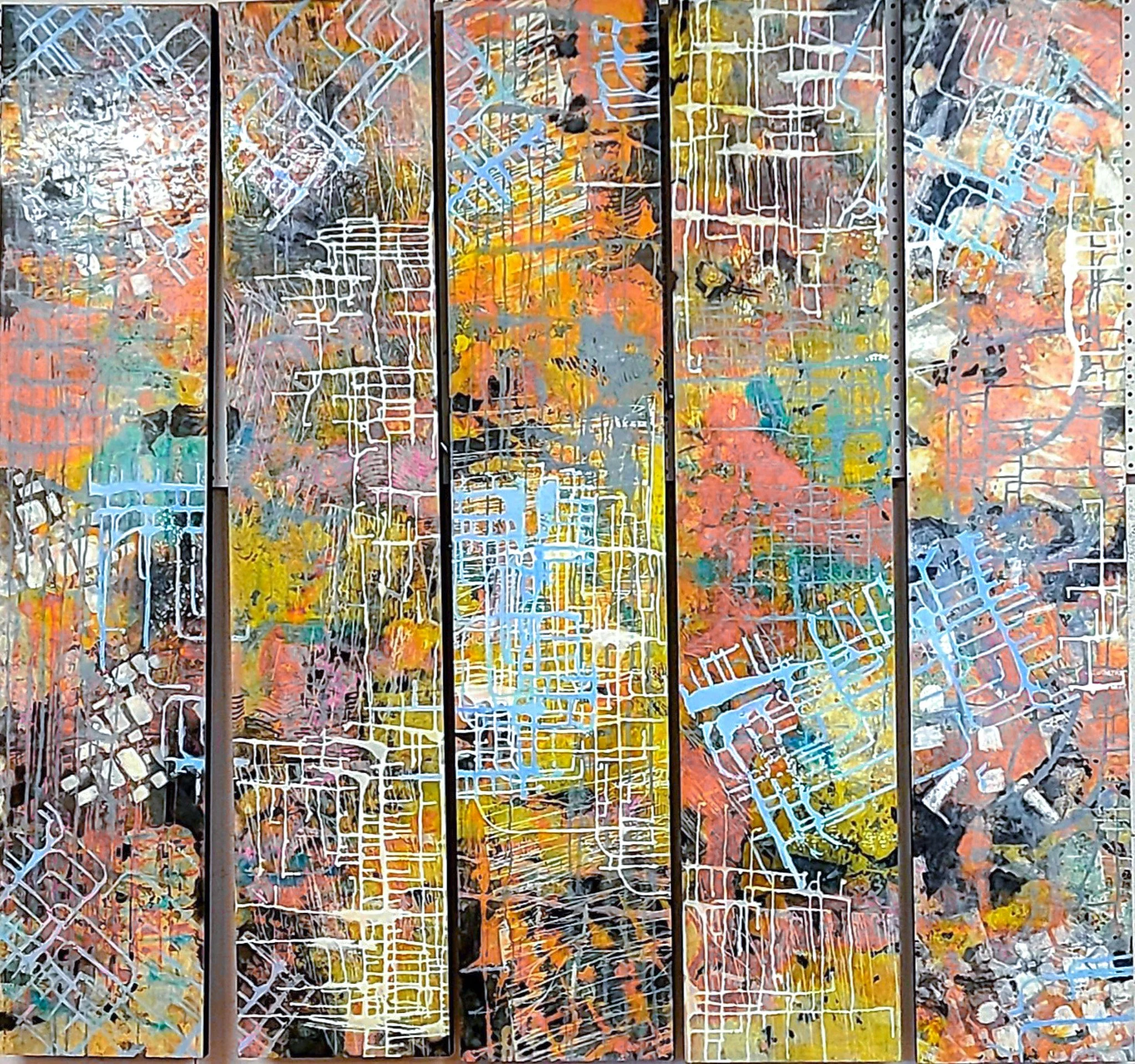 Encaustic, Silkscreen & Mixed-Media / 5 panels, each panel 12x60, overall size 60x60 / Juried- Honorable Mention by The Curtis Center for the Arts / SOLD